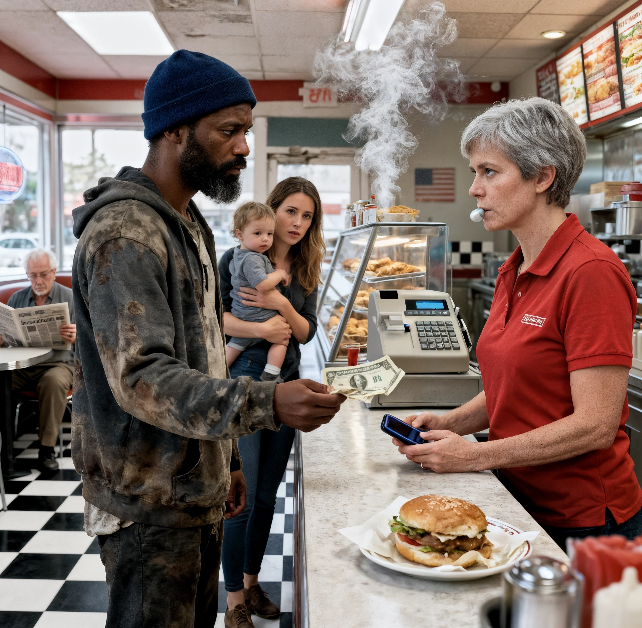 Jordan Ellis si fermò a pochi passi dal bancone, il panino per la colazione ancora intatto in mano. L’operaio, scioccato dalla risposta gelida di Denise, fece un passo indietro in silenzio e si sedette in un angolo. La giovane cassiera con il grembiule rosa ridacchiava ancora, scorrendo lo schermo del telefono, ignara della tempesta che stava per abbattersi.