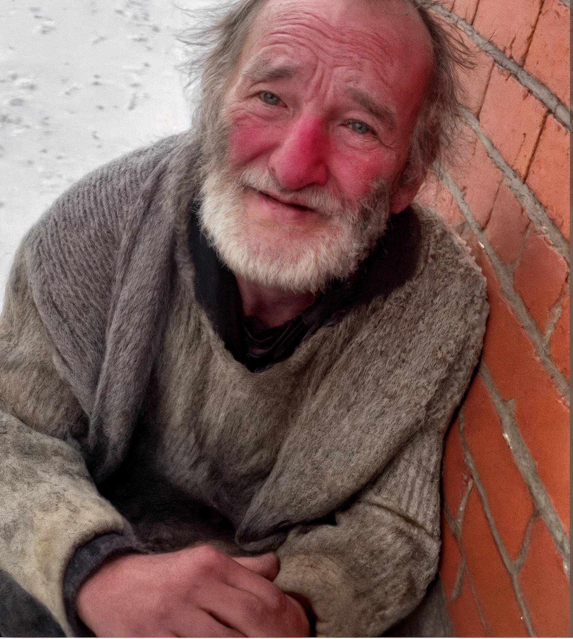 Lui era seduto contro il muro di mattoni vicino all’ingresso, sistemato con cura per non intralciare la porta. Aveva le spalle curve in avanti e le mani nascoste sotto le ascelle. Un cartoncino era appoggiato al ginocchio.
