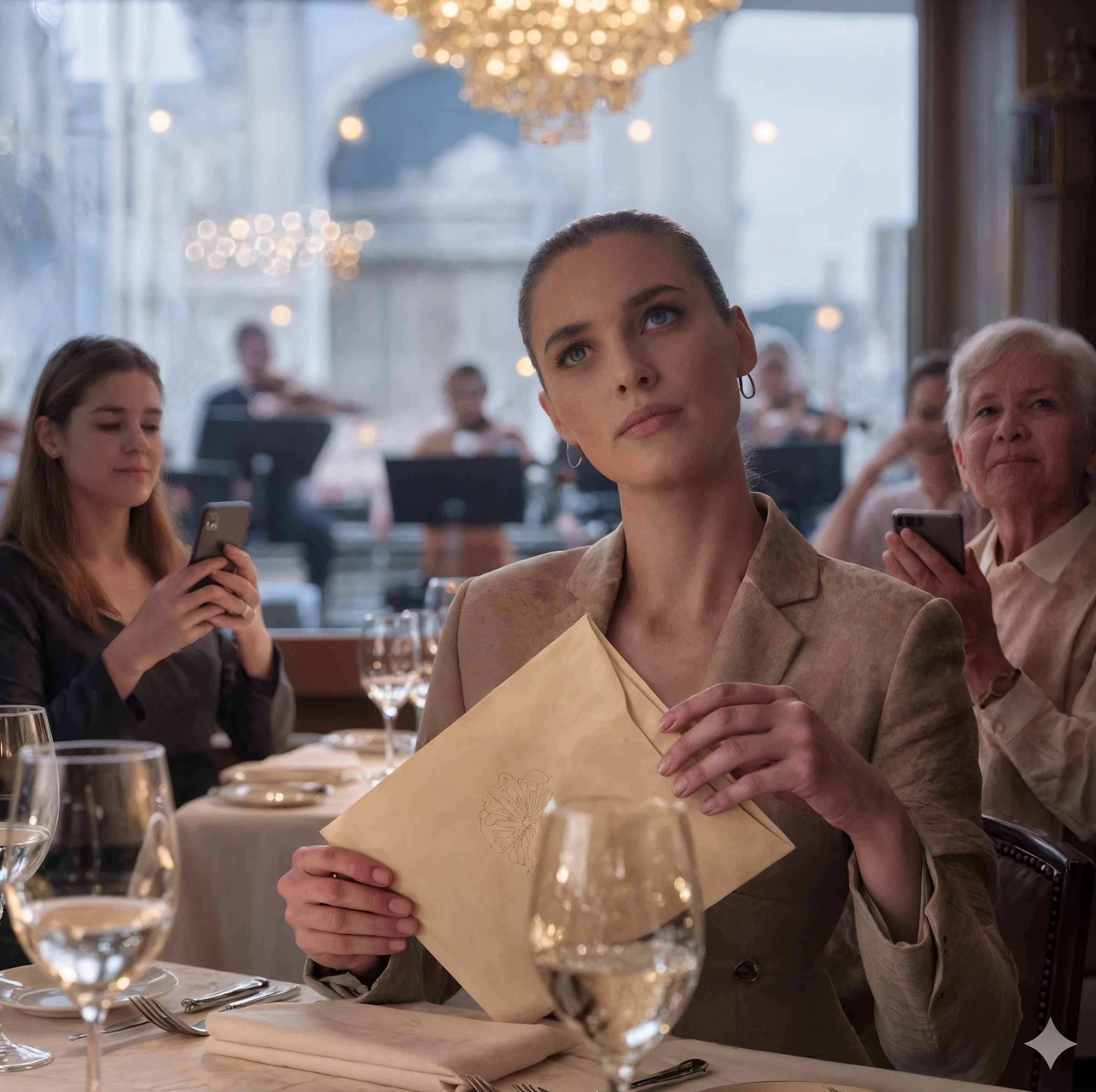 Un cameriere comparve, posando una busta bianca immacolata accanto al mio piatto. Mio padre si schiarì la gola, l’autorità provata che riempiva la pausa. “È tempo che andiamo avanti,” disse, sistemando i gemelli.
