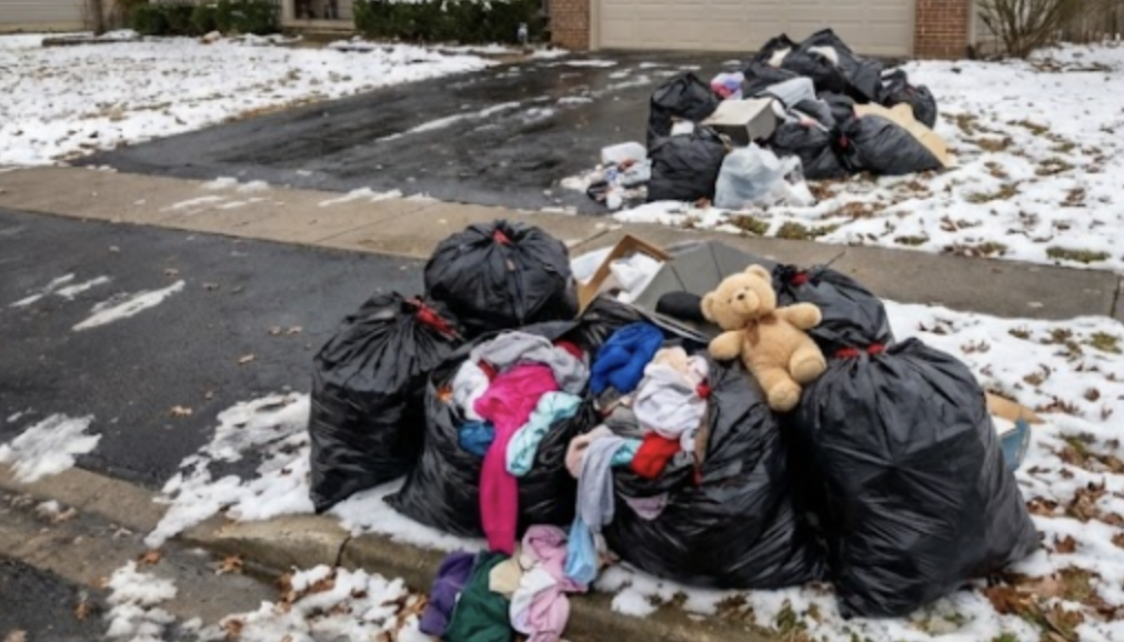 Le nostre cose erano ammucchiate sul marciapiede, chiuse in sacchi neri della spazzatura, come rifiuti in attesa del camion. Da uno spuntava la copertina preferita di Emma, con il bordo rosa che svolazzava nel vento.