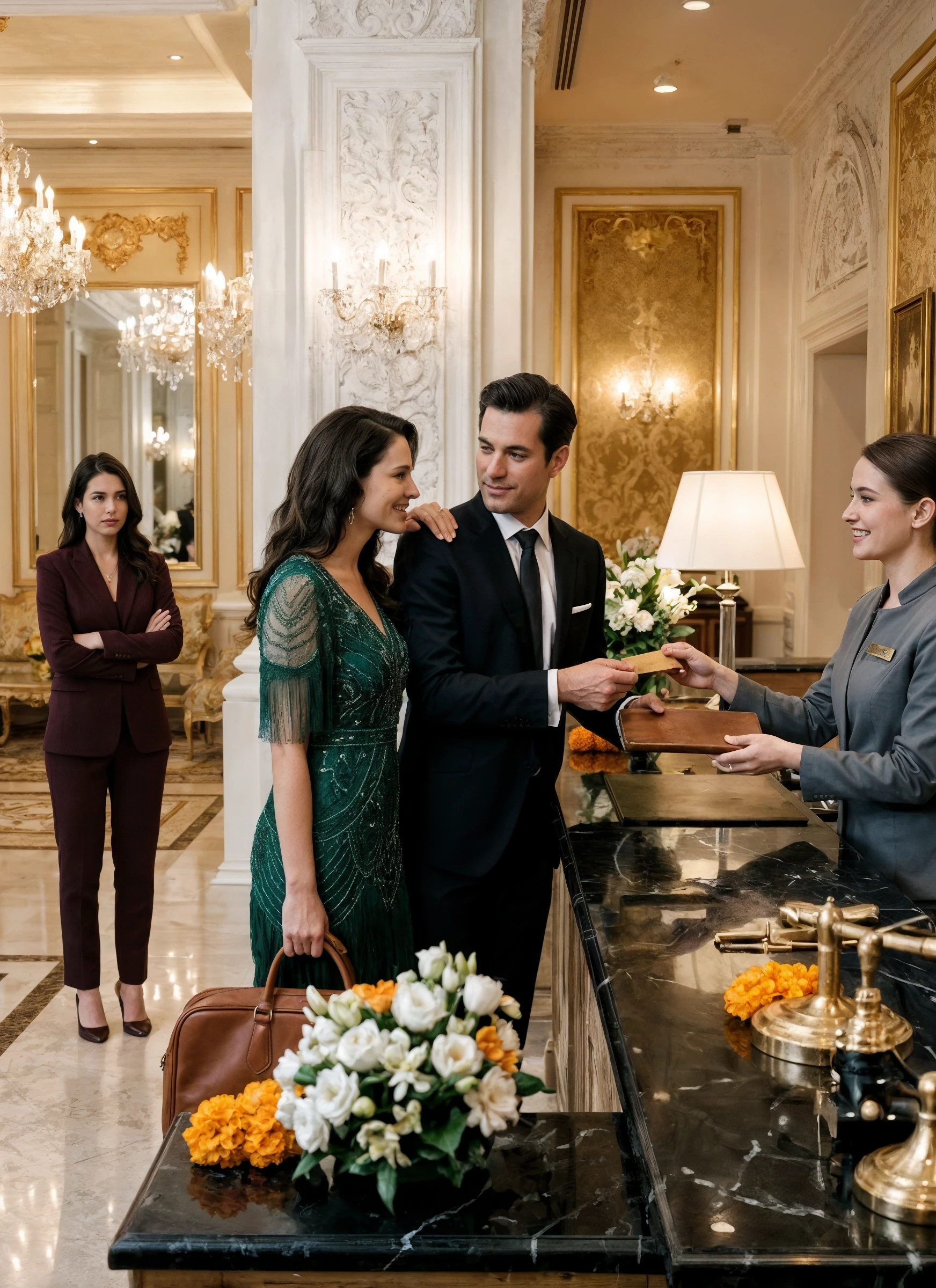 «Questo posto è incredibile», sussurrò Nadia, sistemando il suo vestito color vino che catturava ogni riflesso di luce. «Non riesco a credere che alloggeremo qui.»